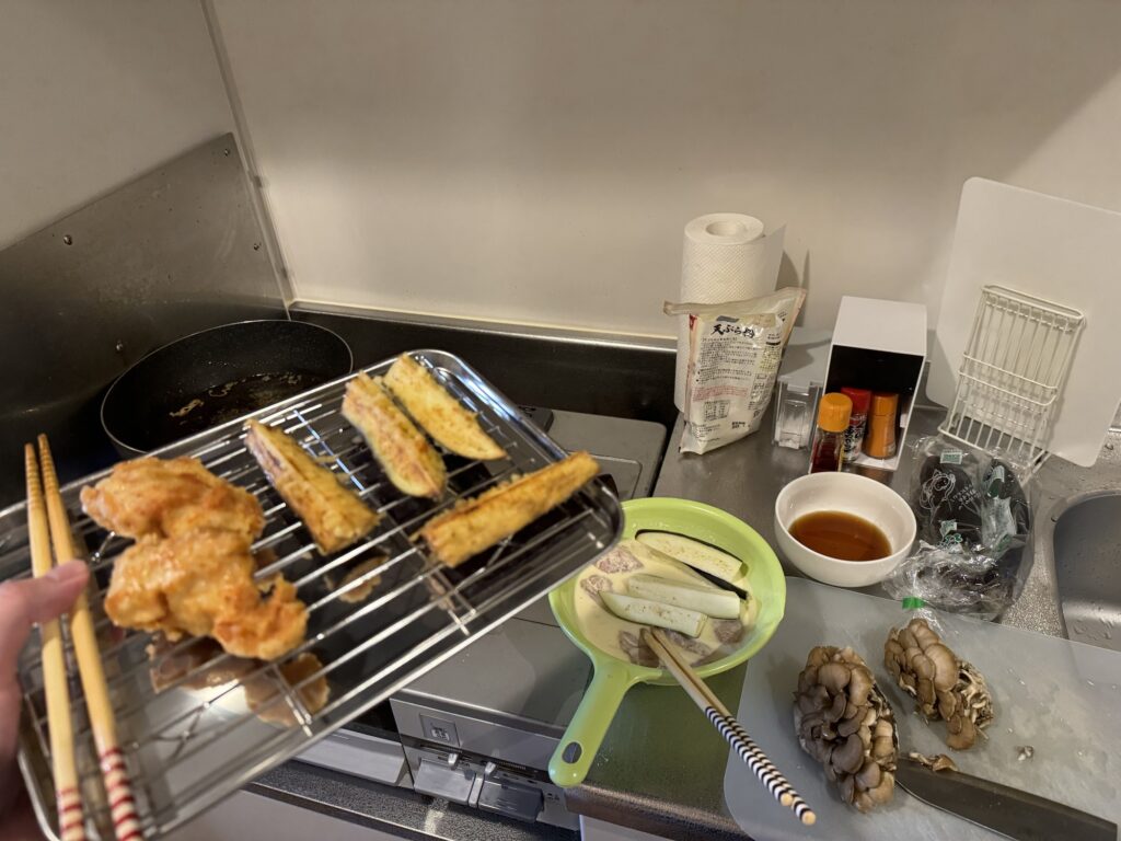 せっかく綺麗にしたキッチンで早速揚げ物をして油を飛ばしまくるのもあれですけど、まぁそんなことは気にしても仕方ない。いつかは汚れるわけだしね。