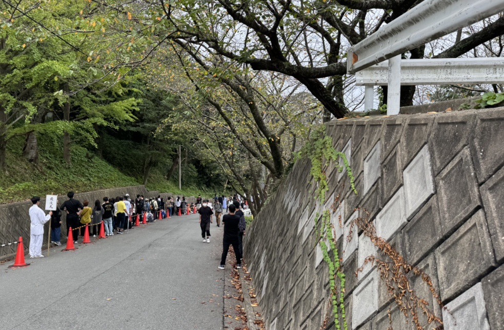 福間駅という駅からバスに乗るのですが、バス停がまぁまぁ並んでいて、結構人気な神社なんだな〜と思いながらバス停を降り、神社への坂道を登っていると、何やら人の行列が。