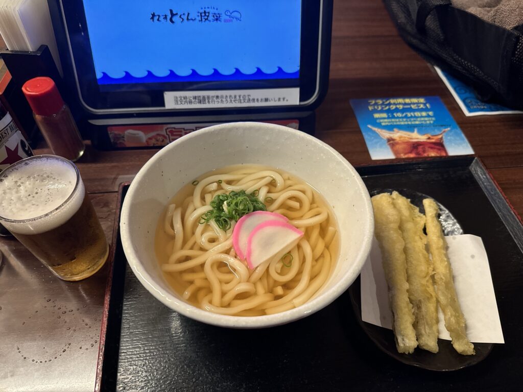 久々の銭湯だったのですが、疲れた身体に染み入ります。最高。で、館内のレストランで風呂上がりのビール。最高。博多名物のごぼう天うどんを食べます。うまい。