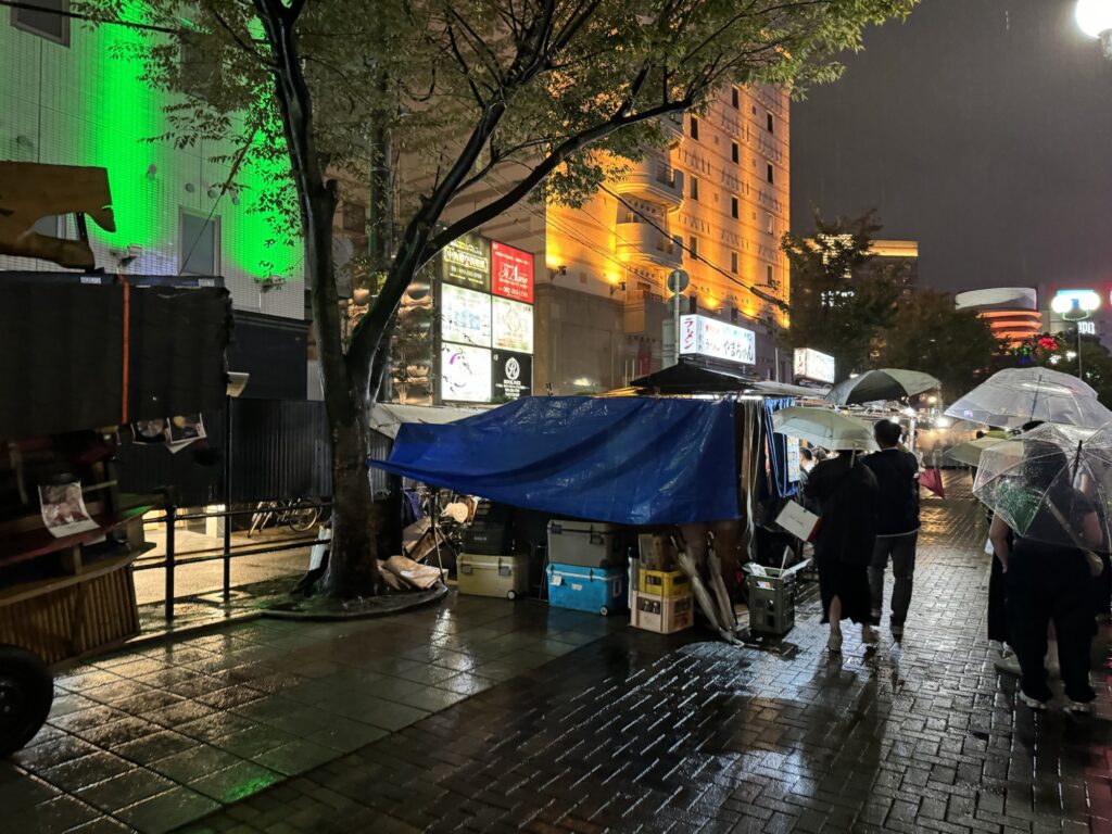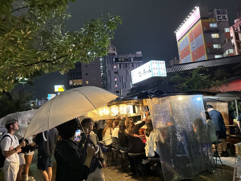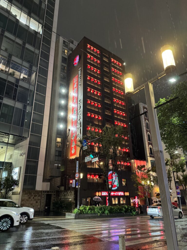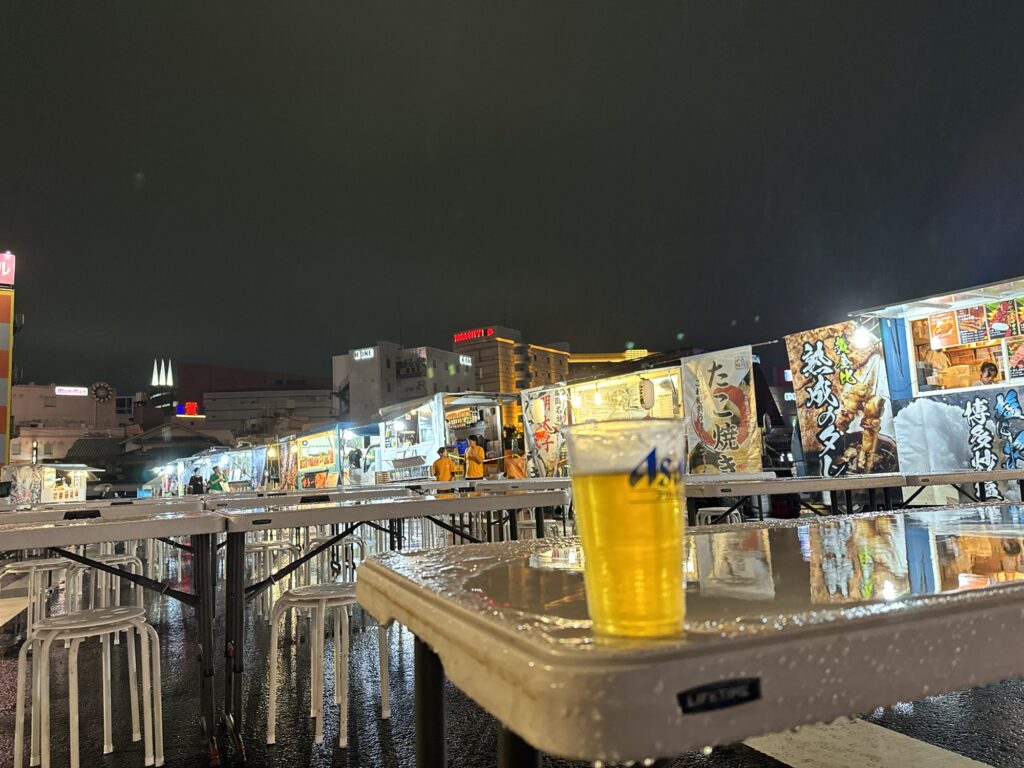ホテルで荷物を置いて向かうはもちろん屋台街。博多といえば屋台でしょ、ってことで外に出ようとすると、めちゃくちゃ雨が降ってました。