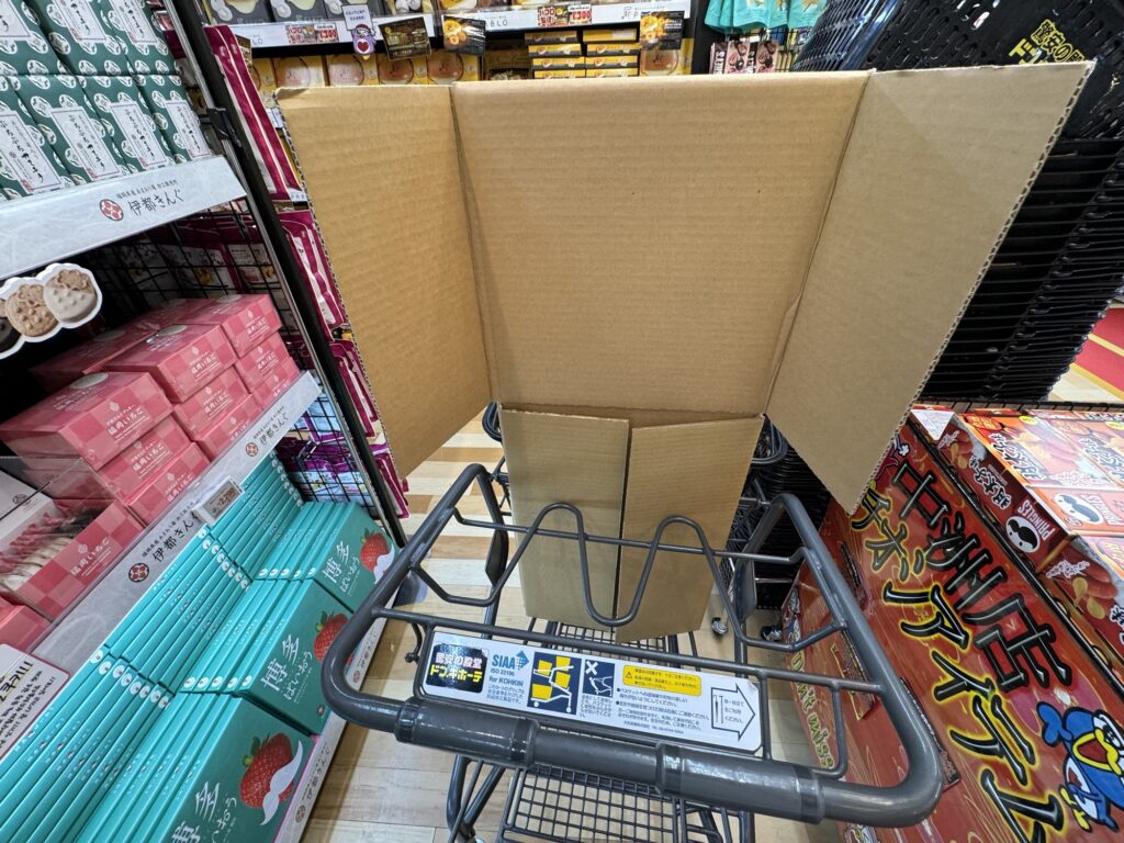 一通りお土産を見繕い、段ボールに詰めこんで配送準備完了。コンビニで自宅に配送でミッションコンプリートです。