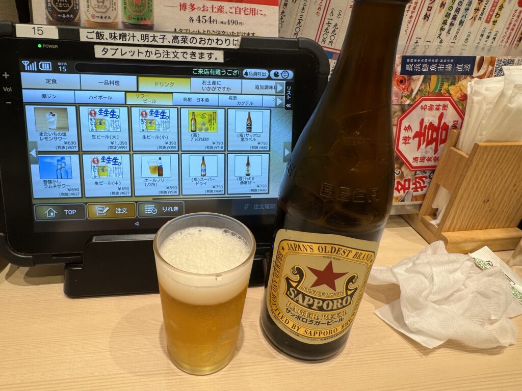 米食い放題なのでビールは迷ったんですが、明太子とビールの組み合わせの誘惑に負けて赤星を1本だけ頼んじゃいました(笑)。