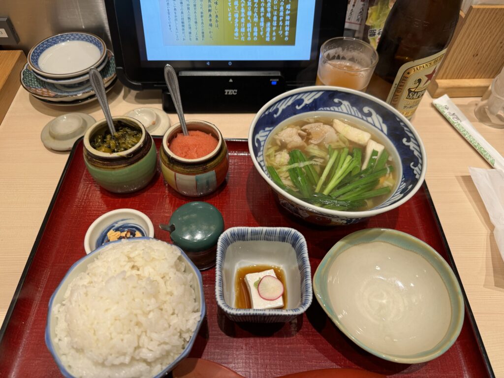 モツ吸い定食にしてみました。これ、まじでビールがすすむすすむ。ビール頼んでよかった~。満足度がめちゃくちゃ高いです。隣と仕切り壁のあるカウンター席なので、自分のペースで楽しめます。まさに幸せが詰まったランチ。店員さんも元気で愛想のいいおばちゃんで、とてもいいお店でした。博多満喫。