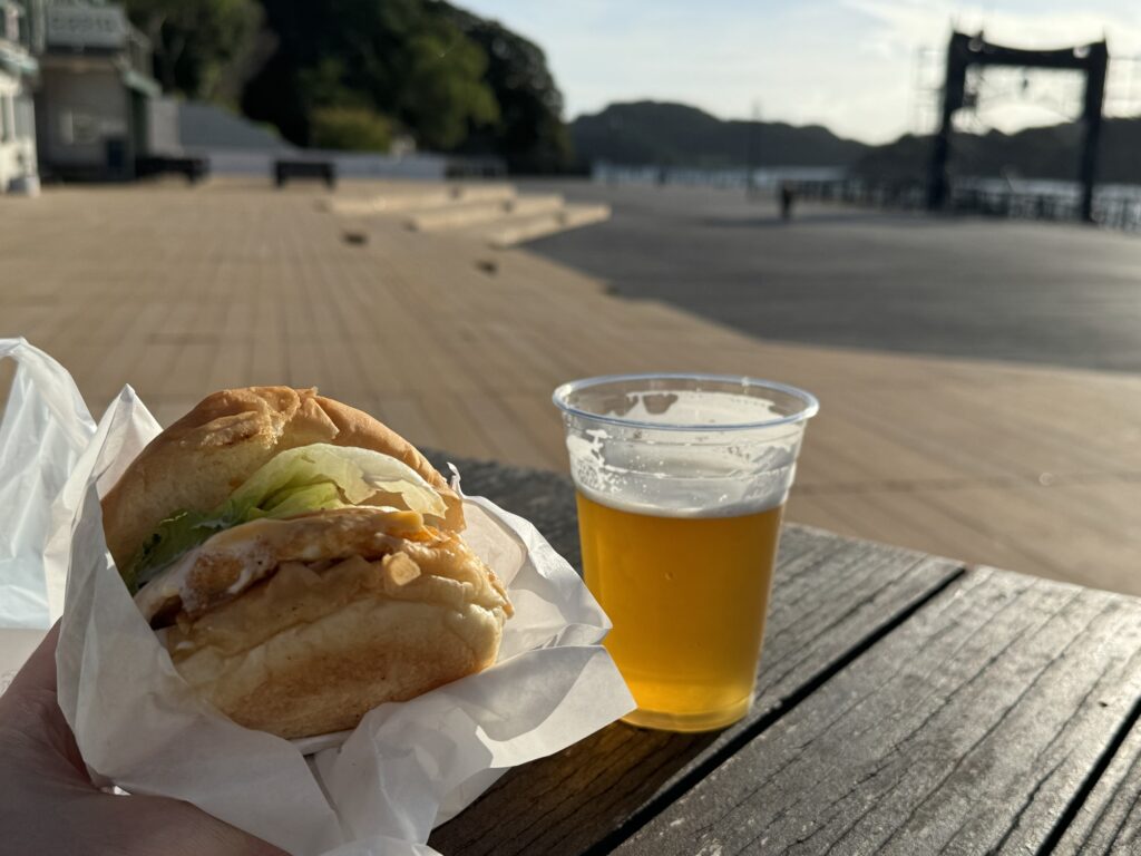 バスで向かったのは九十九島パールシーリゾートという水族館などがある観光地。本日宿泊するホテルはここから歩いて10分ほどの場所です。ほんとはホテルのチェックインして荷物を置いてからこの辺で遊ぼうと思ってたのですが、もう16時前で色んな施設の閉園も近づいているので、荷物をもったまま、まずは佐世保バーガーとビールを売店で購入しました。