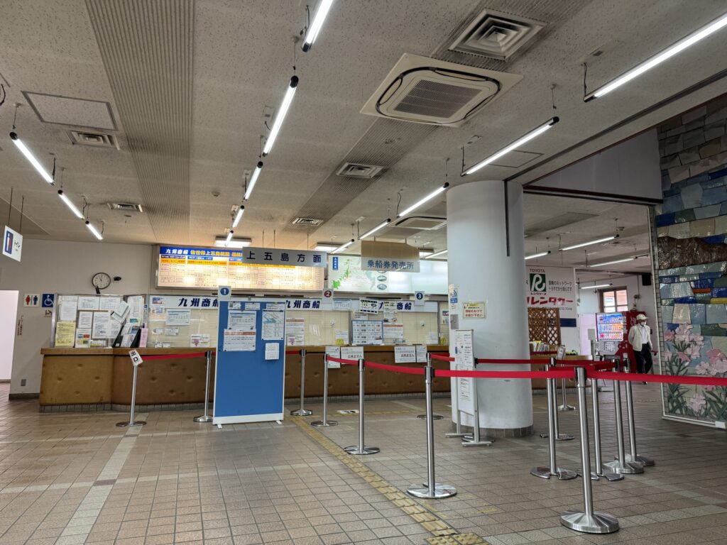 そしてフェリーのチケット売り場へ行きます。佐世保駅から見て最初に出会う建物のチケットカウンターに行き、有川にいきたいんですが、というとどうやら行き先で建物が分かれているようで、有川行きは佐世保駅から見て奥側の茶色い建物だと教えてもらいました。