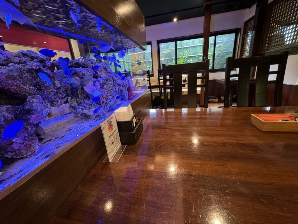 向かったのは(くう)というカフェレストラン。入店すると感じのいい店員さんが迎えてくれます。1人用のカウンター席などはないお店だったようで、4人のテーブル席に案内してもらいました。テーブル横に水槽があっていい雰囲気。