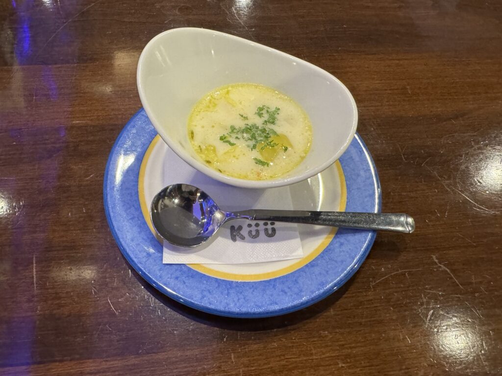 トルコライスを注文、まずはクラムチャウダーが出てきます。これが二日酔いの身体に染み渡りました。うまい…