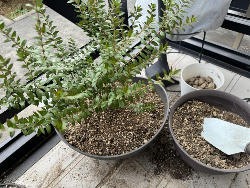 ローズマリーは狭いプランターの中で結構根を伸ばしていたようで、引きはがすのが大変でした。なんだかんだ狭い部屋の中でドワーフマートルとうまいことやってたんだね。これからは別の部屋になるけど、お隣さんにするから安心してくれ。
