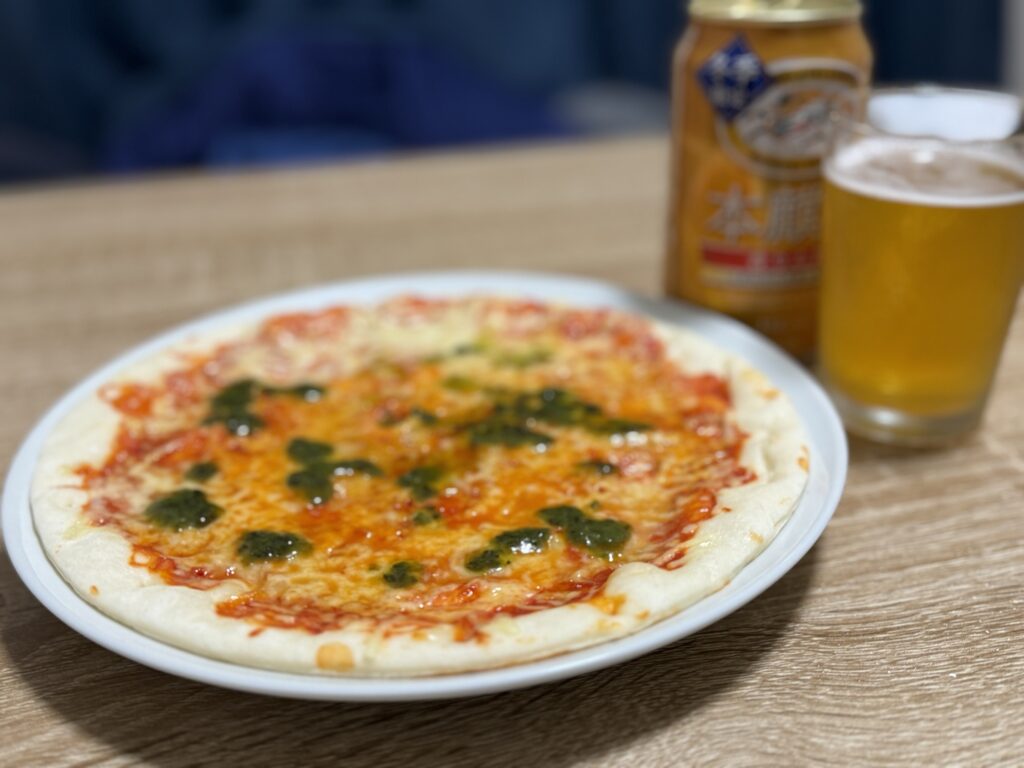 本当に正直な感想を言うとビールとしてのうまみは感じられないので、つまみ必須ですね。私基本的につまみなしビール単体でいける口なんですが、これはつまみないと無理。それも軽めじゃなくてけっこうこってりしたやつね。ってことでピザをチンしました。