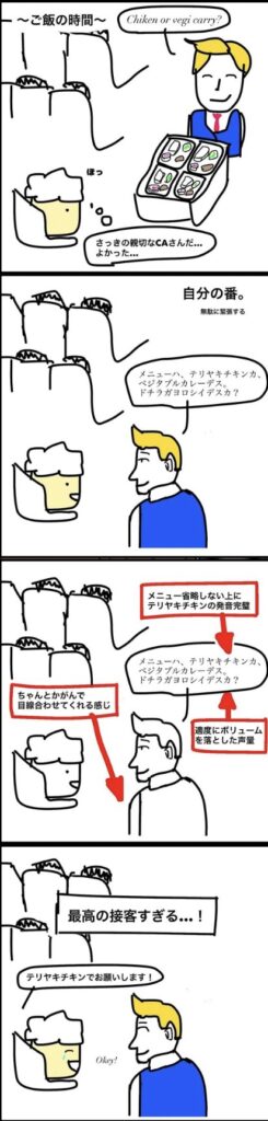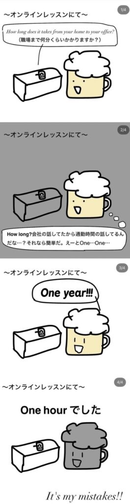 そしてこちらの作品。イギリスに一人旅に行った時の行きの飛行機のエピソードです。オンライン英会話の4コマ漫画から、ほかの人物も登場させたり機内の景色を描いてみたりと少しはレベルアップしましたが、その分作成にかかる時間も増えました。