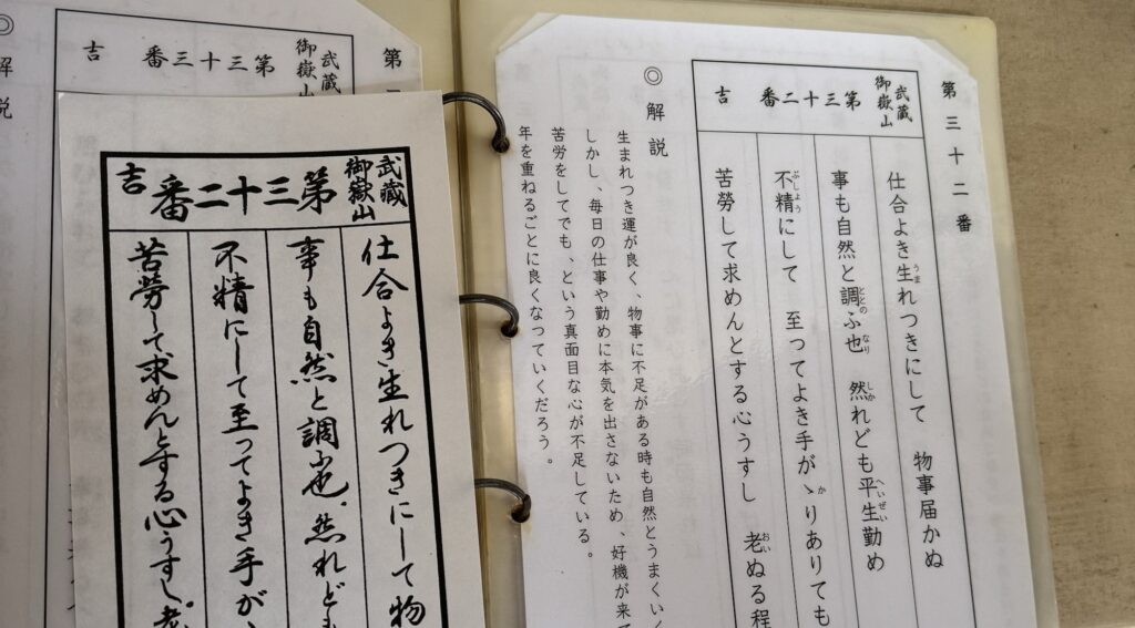 そうしてようやく登り切って神社へ。せっかくなのでおみくじを引いてみました。結果は吉。このおみくじ、紙に書いてあることはまるでわからないんですが、解説書みたいのが置いてあるのでそれを参照する必要があります。