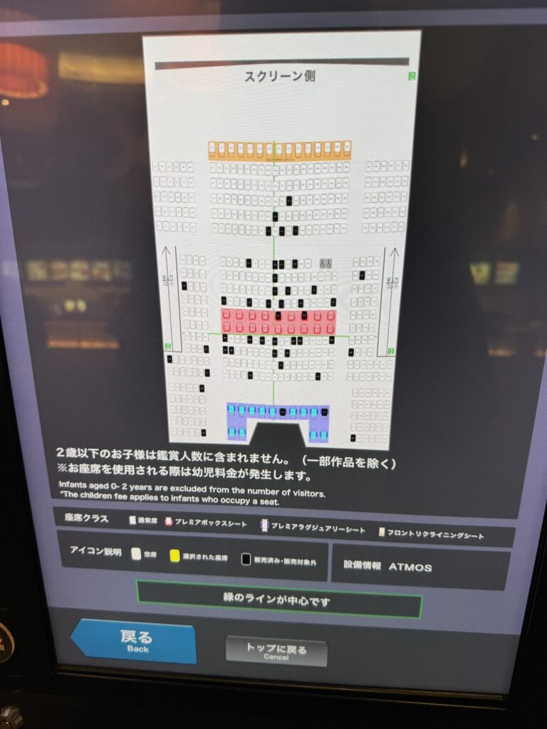 TOHOシネマズに到着しまずはチケットを発見。ムビチケを購入していましたが、ドルビーアトモスは追加で200円かかります。上映開始時間5分前の席の埋まり具合はこんな感じで極めてまばらです。